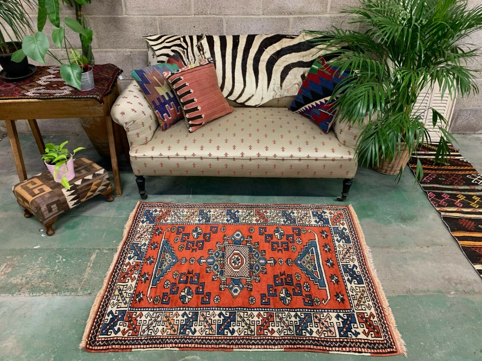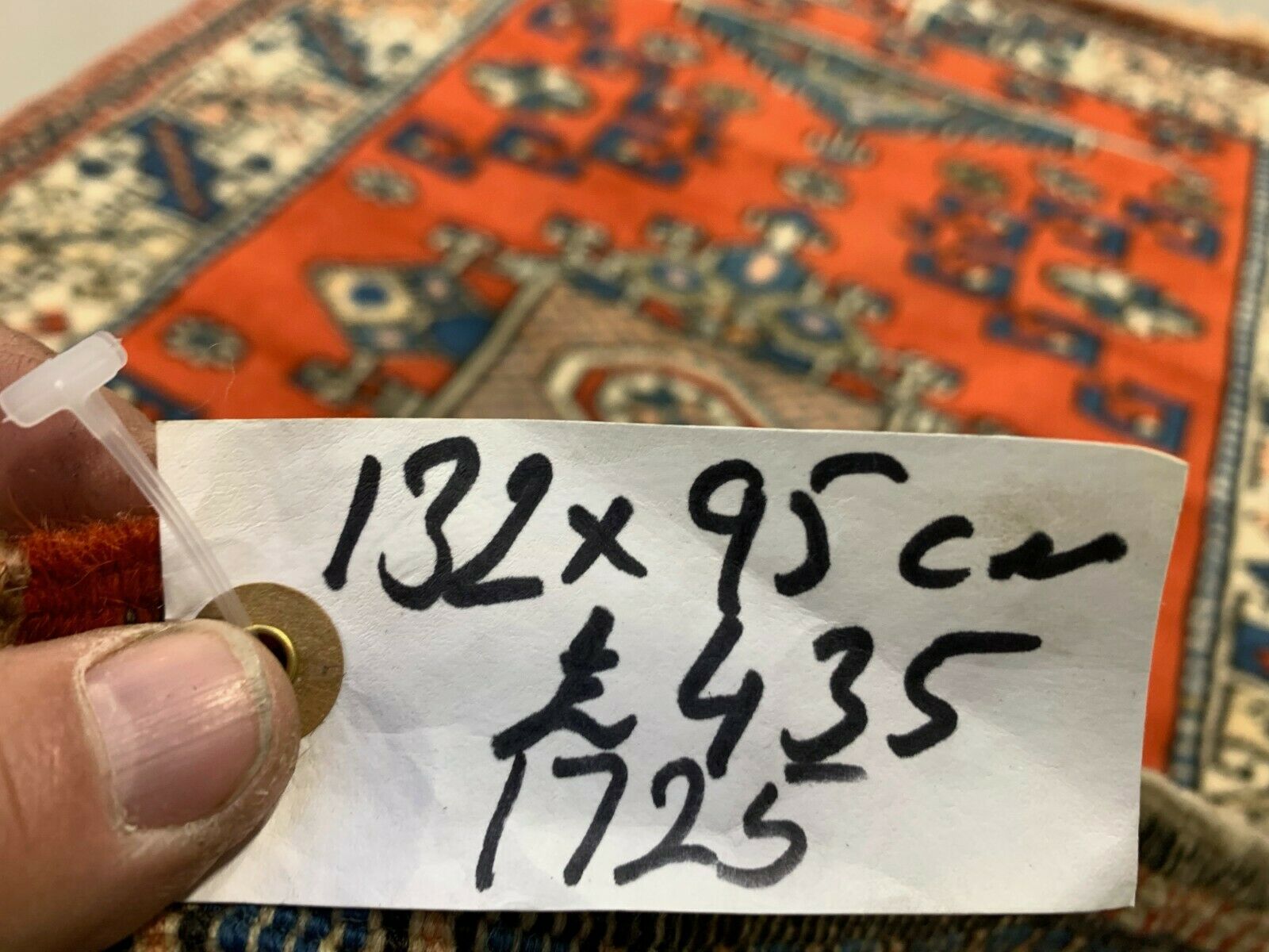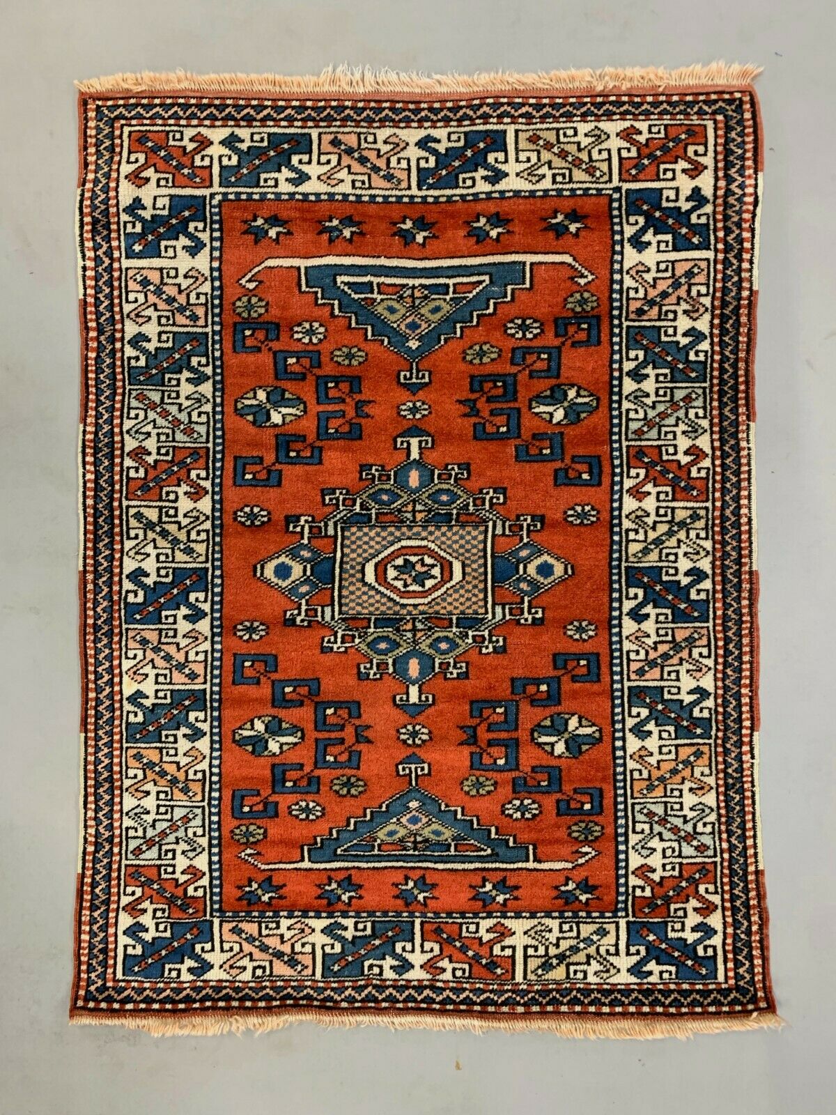 Old Turkish Kazak Rug Oriental 132x95 cm vintage tribal carpet, Red and Blue