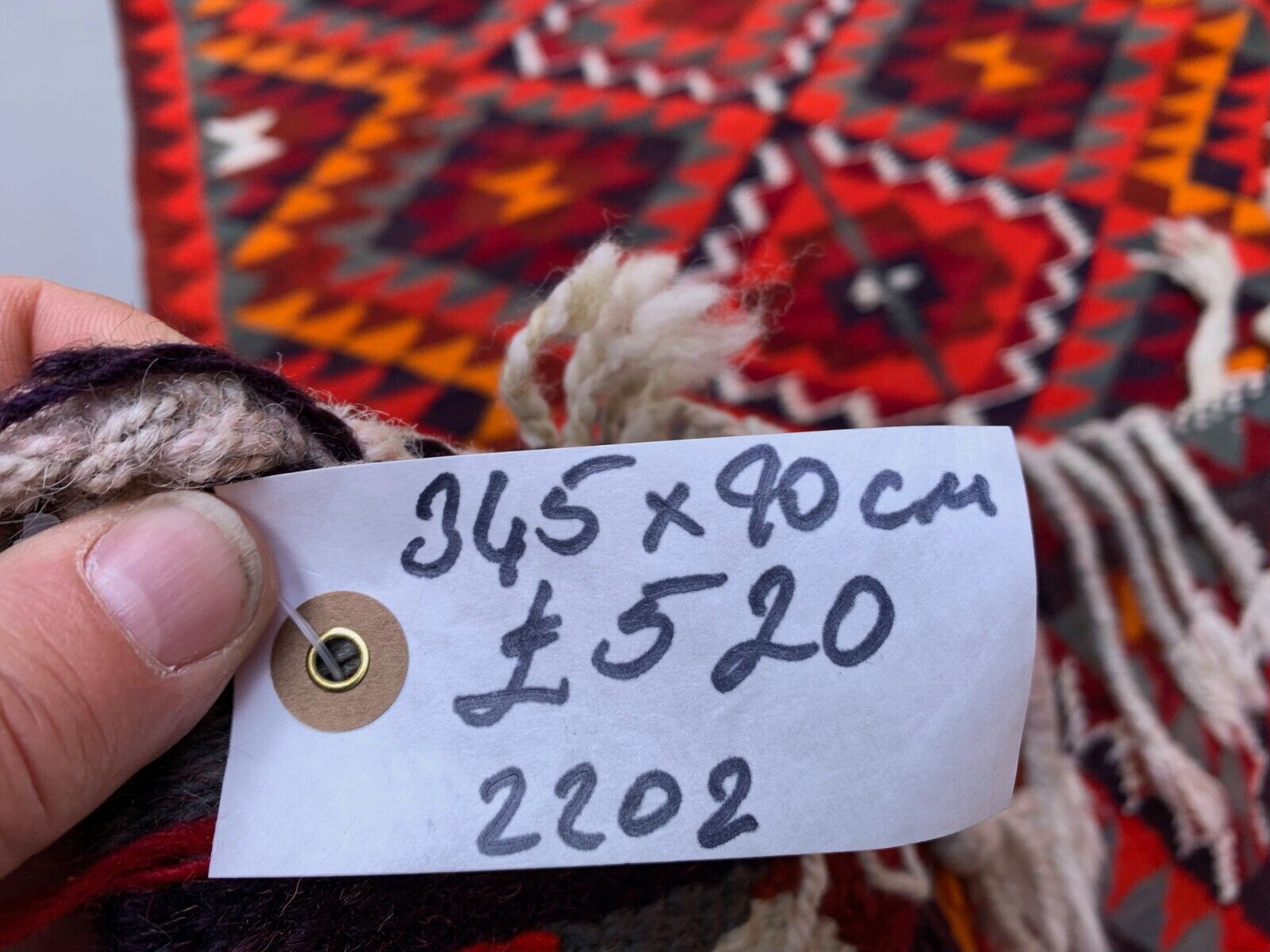 Old Turkish Kilim Runner 345x90 cm, Vintage Kelim Rug, Long and Narrow