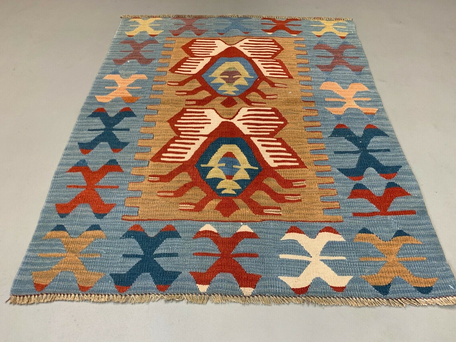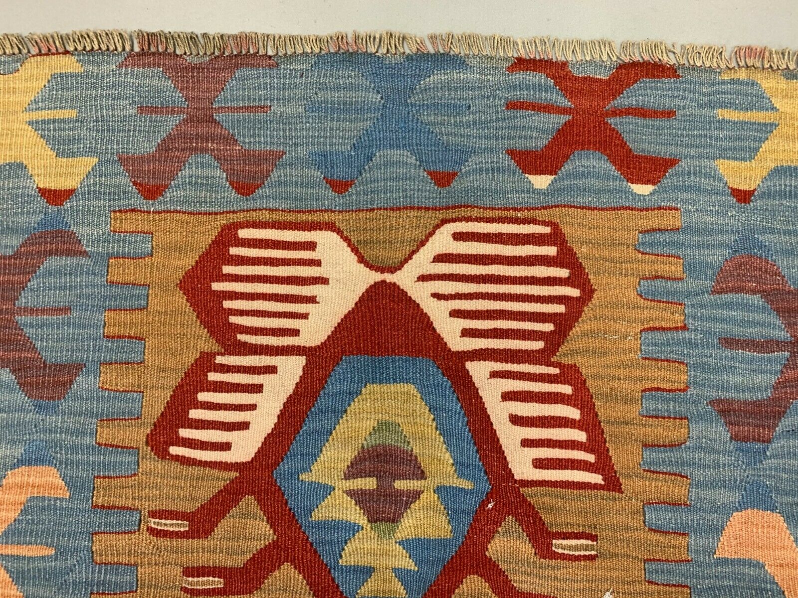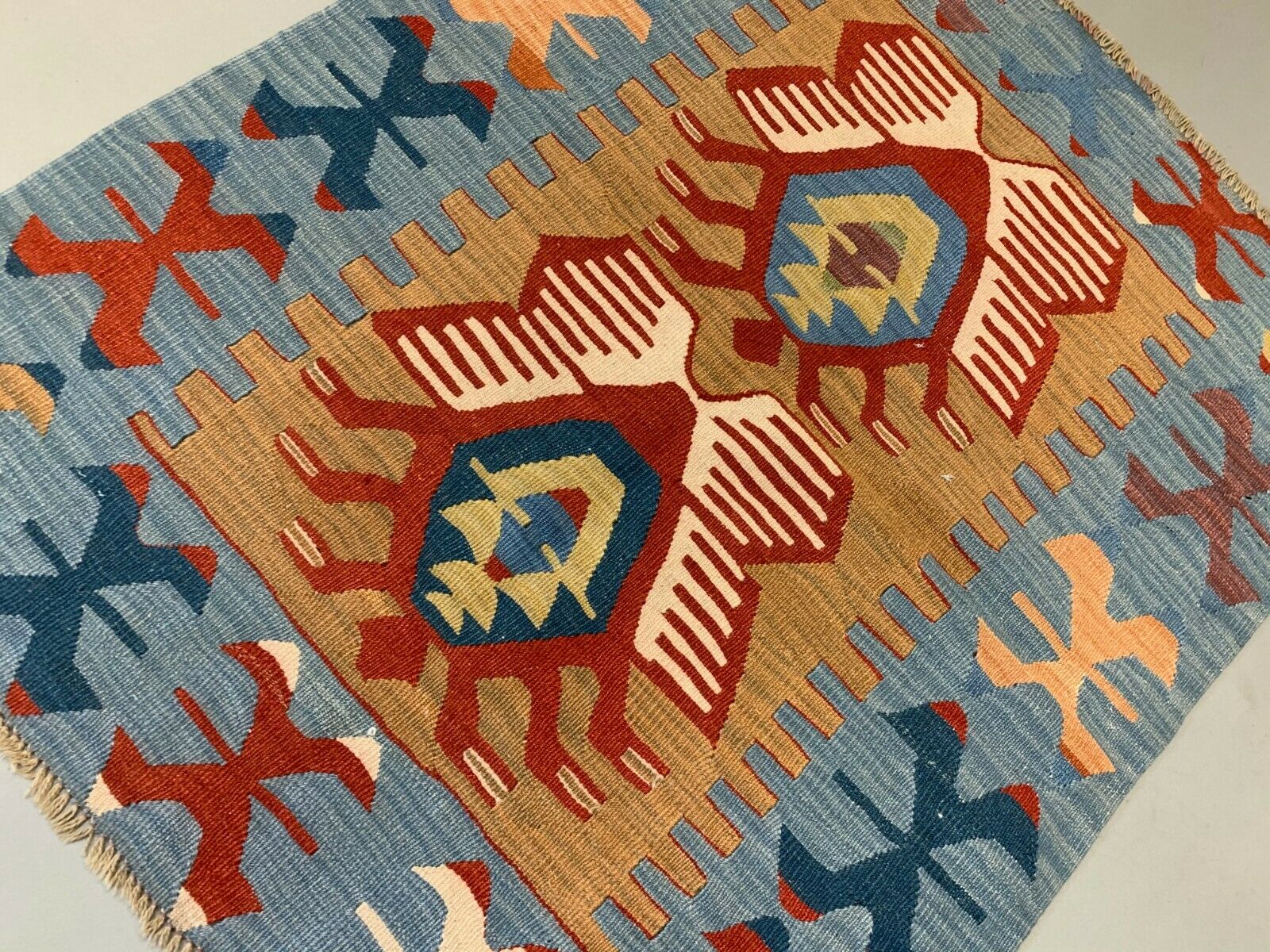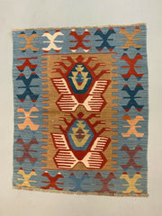 Small Vintage Turkish Kilim 107x86 cm Wool Kelim Rug Red Blue Brown