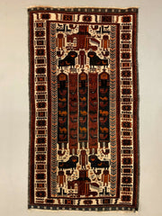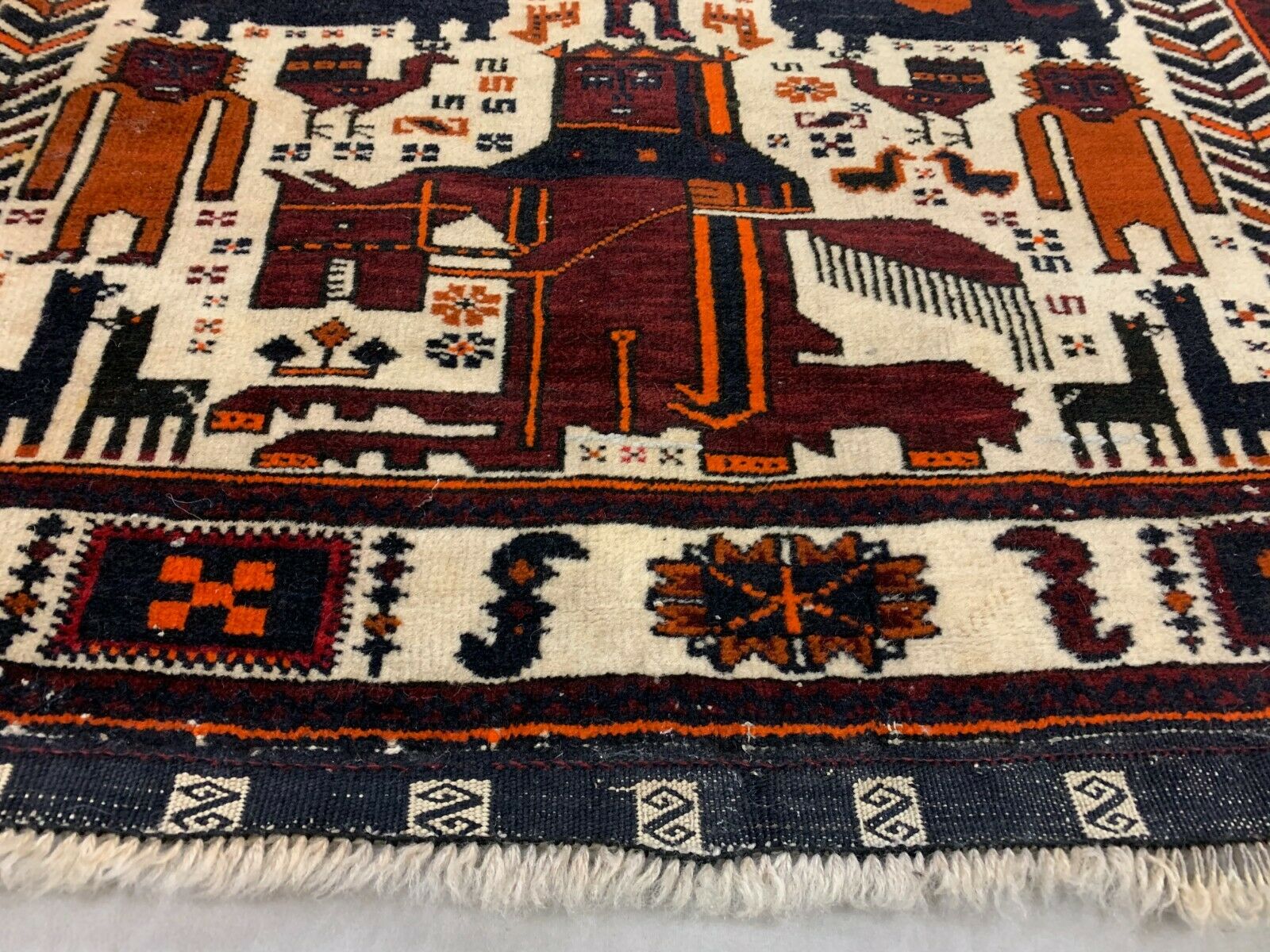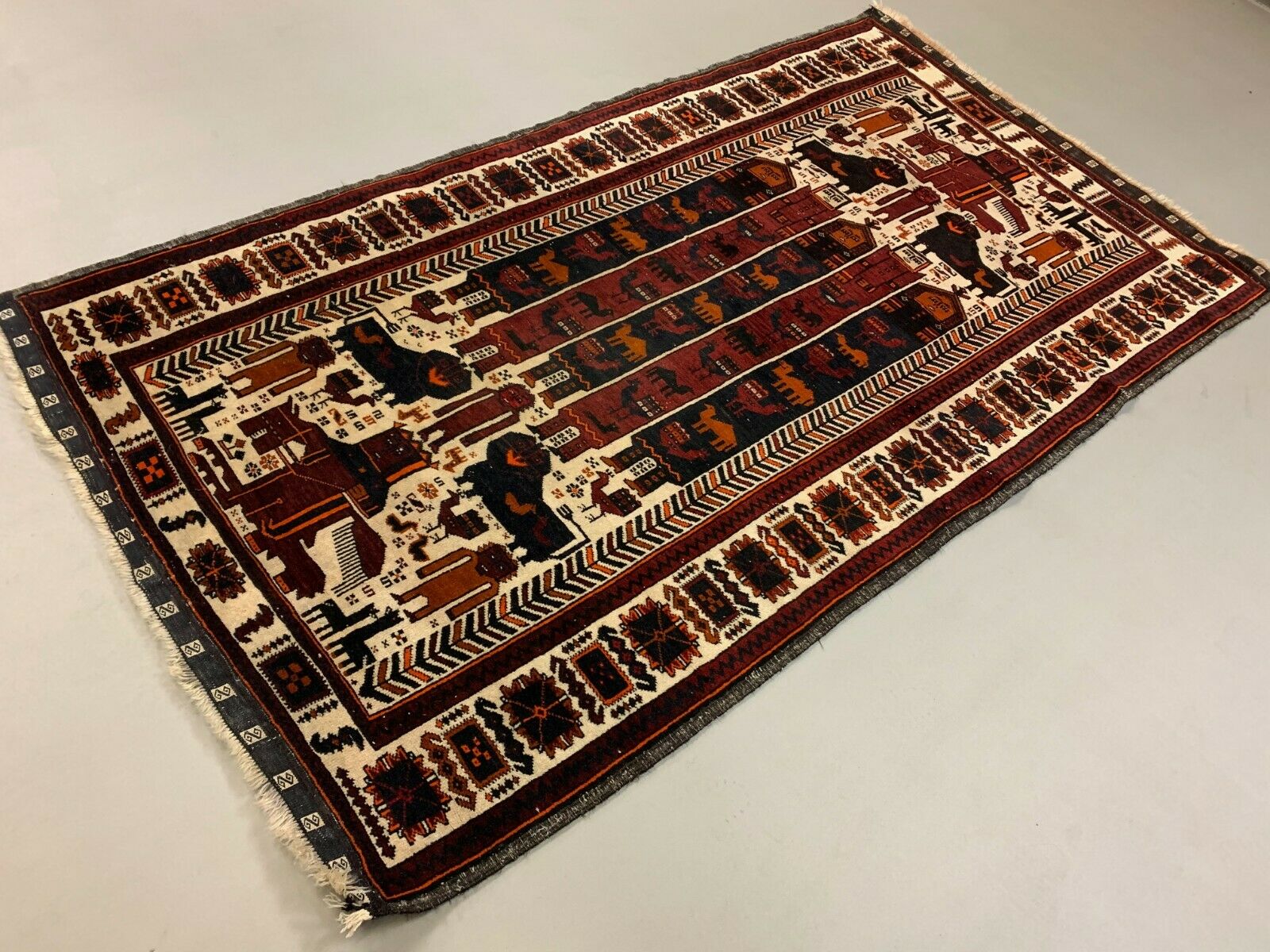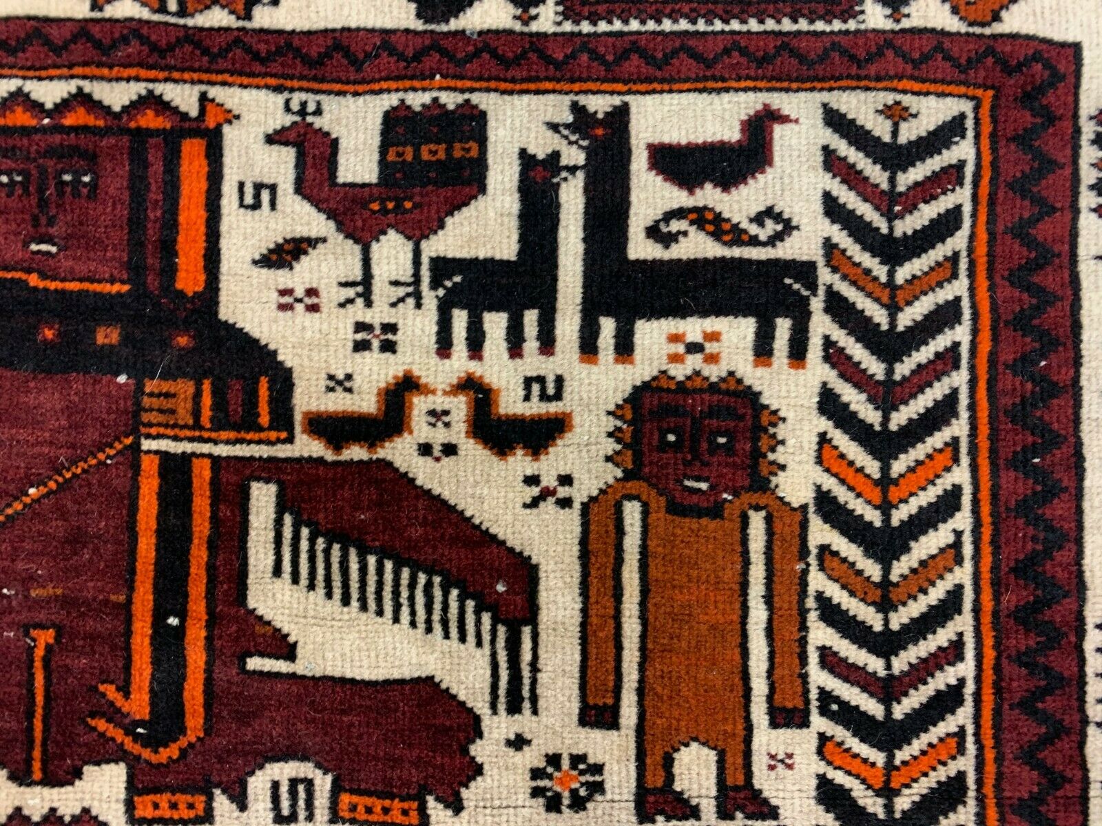 Vintage Tribal Lion Rug 204x110 cm, Old Tribal Wool Carpet, Black, Red Cream
