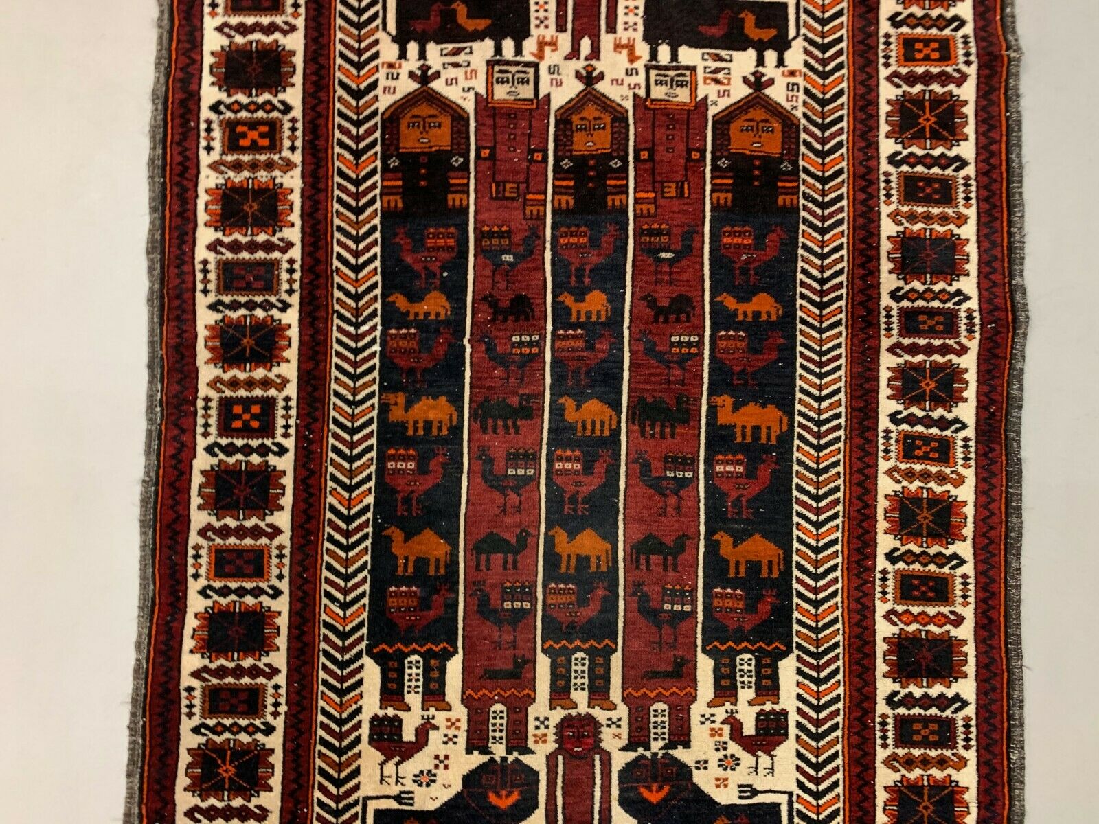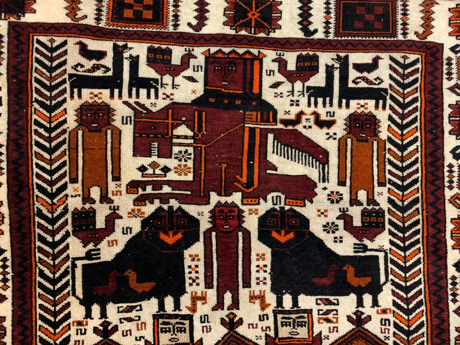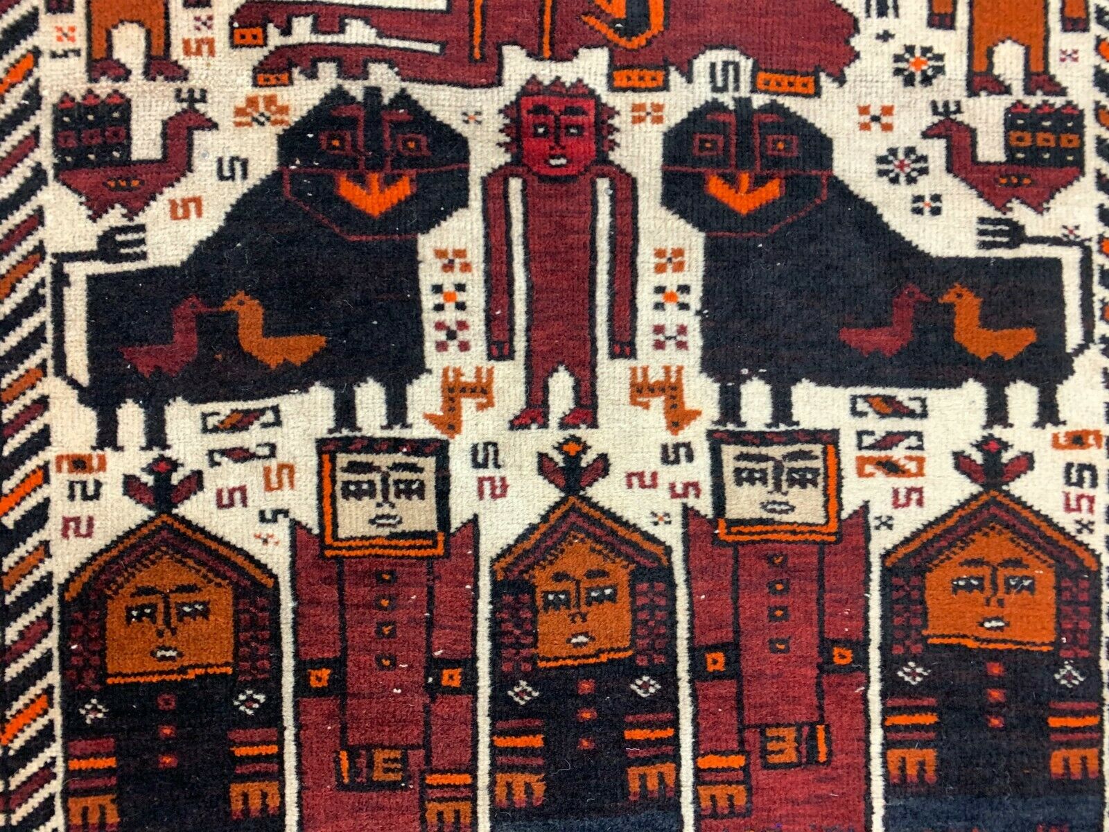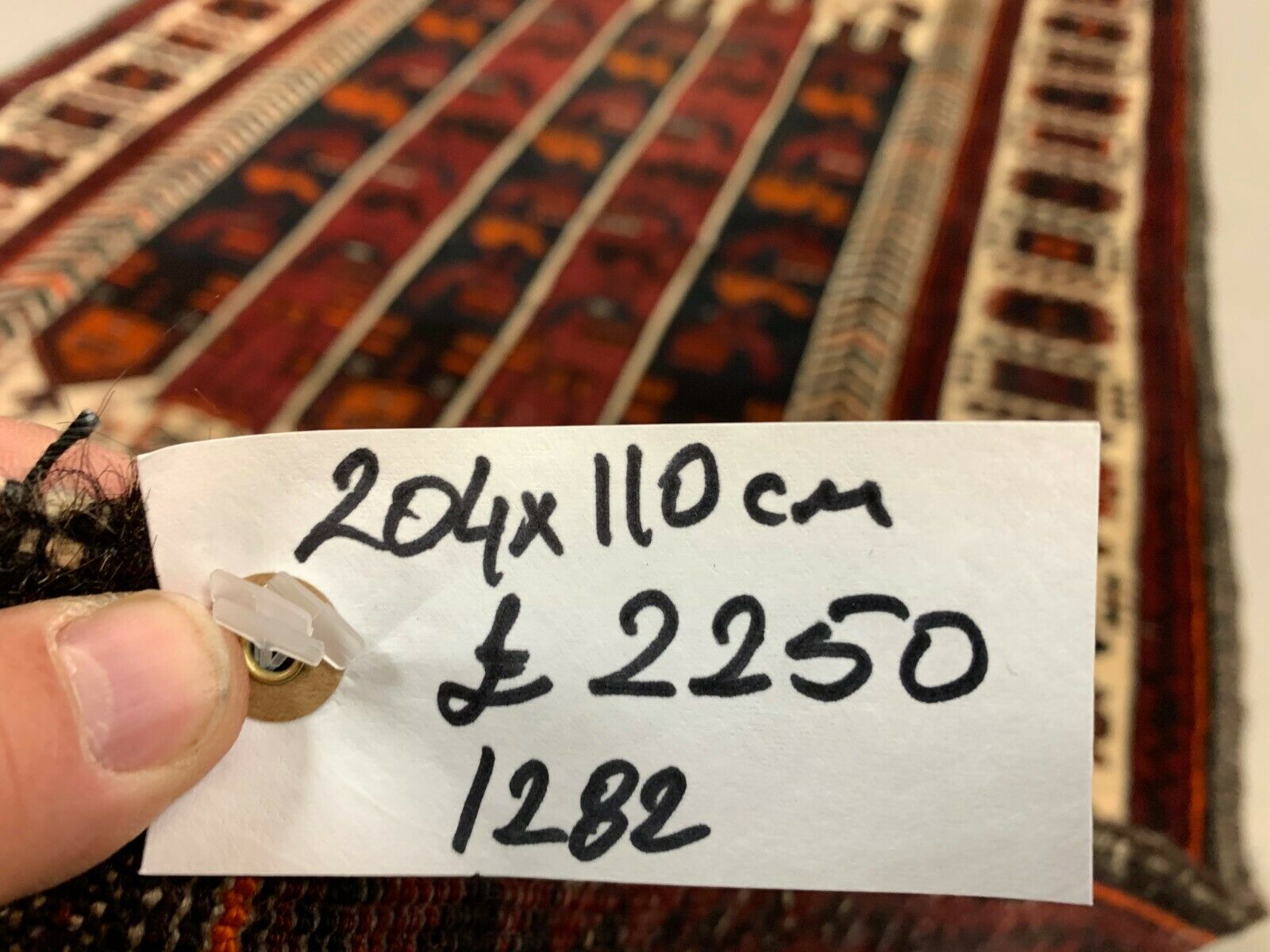 Vintage Tribal Lion Rug 204x110 cm, Old Tribal Wool Carpet, Black, Red Cream