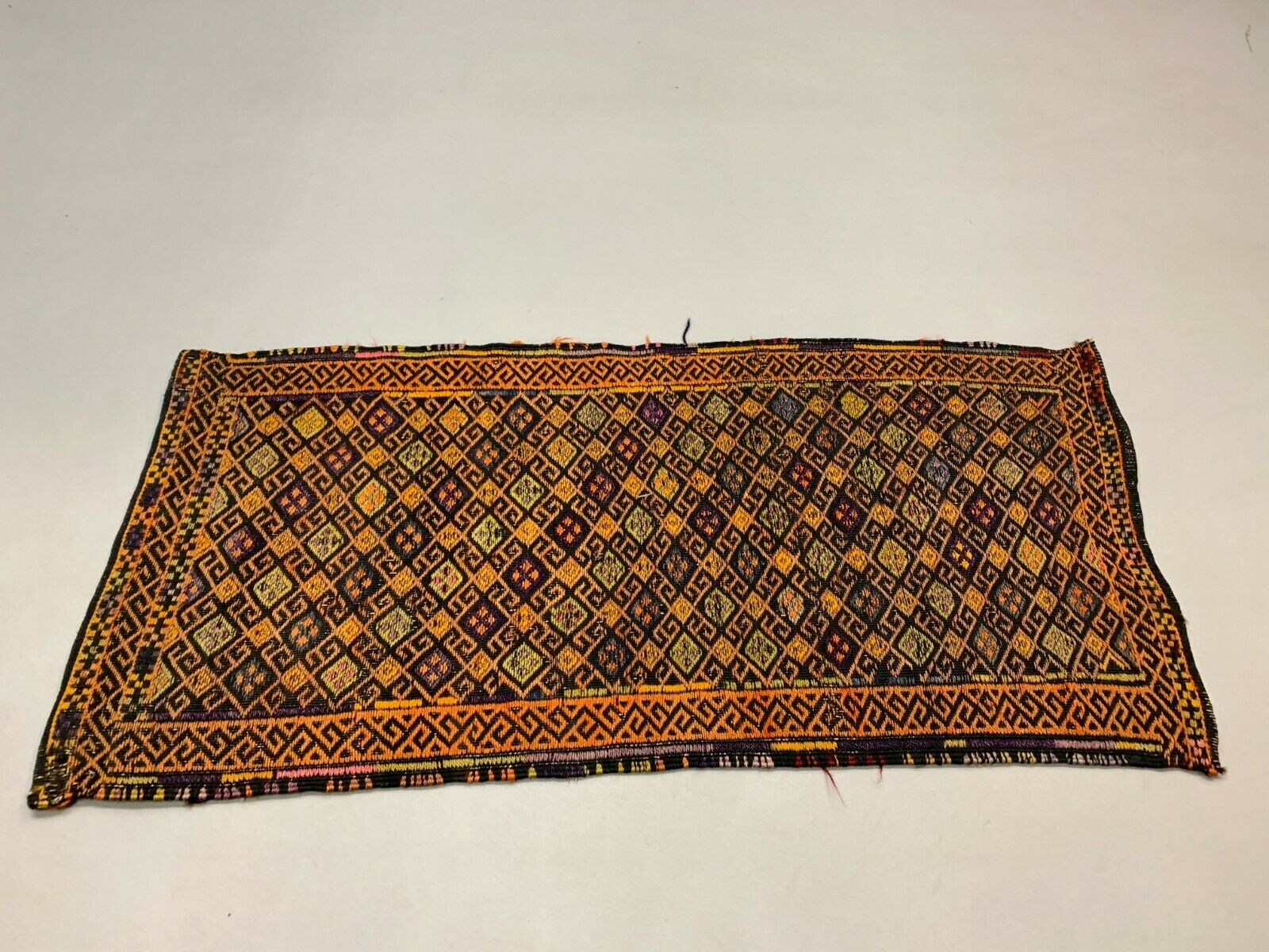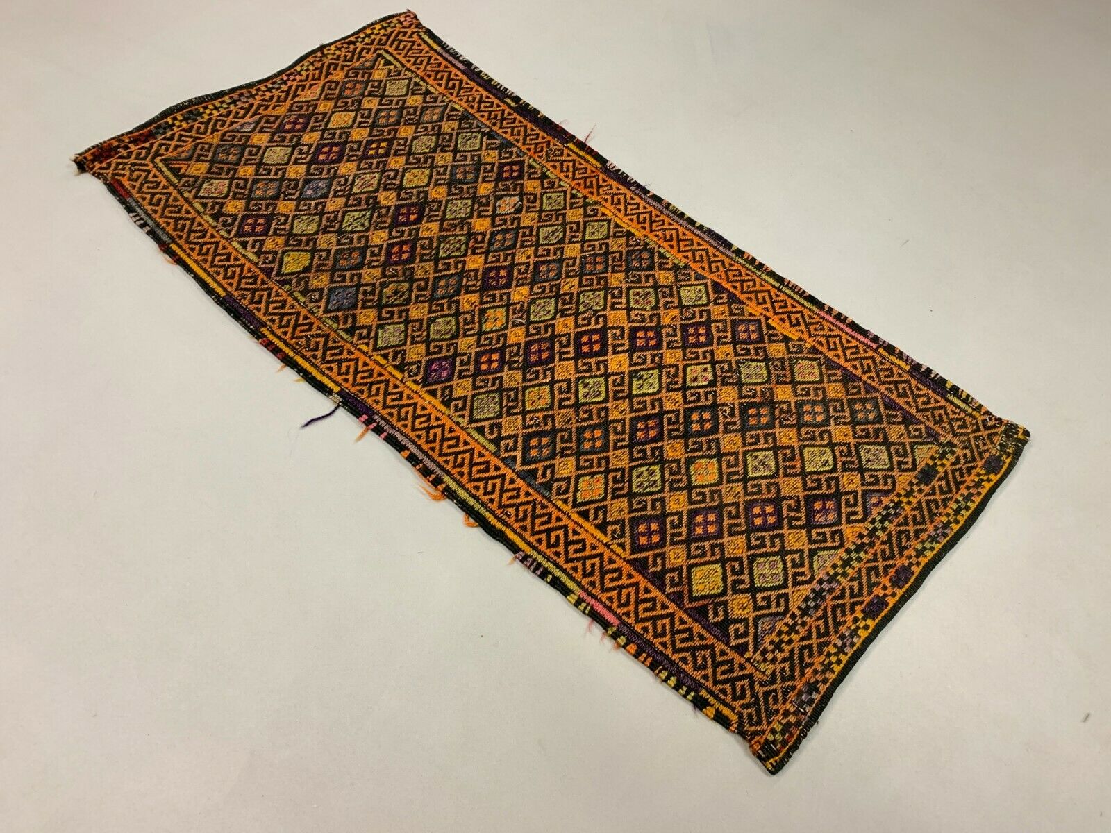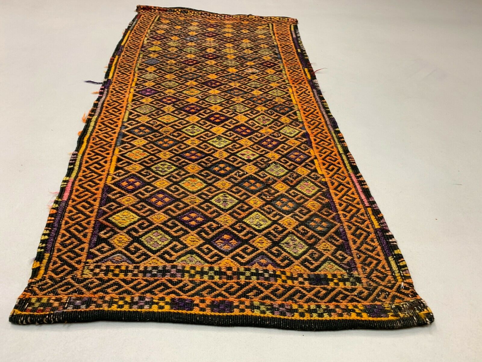Vintage Turkish Mini Kilim 120x58 cm Shabby Wool Small Kelim Rug, Red Black Gold