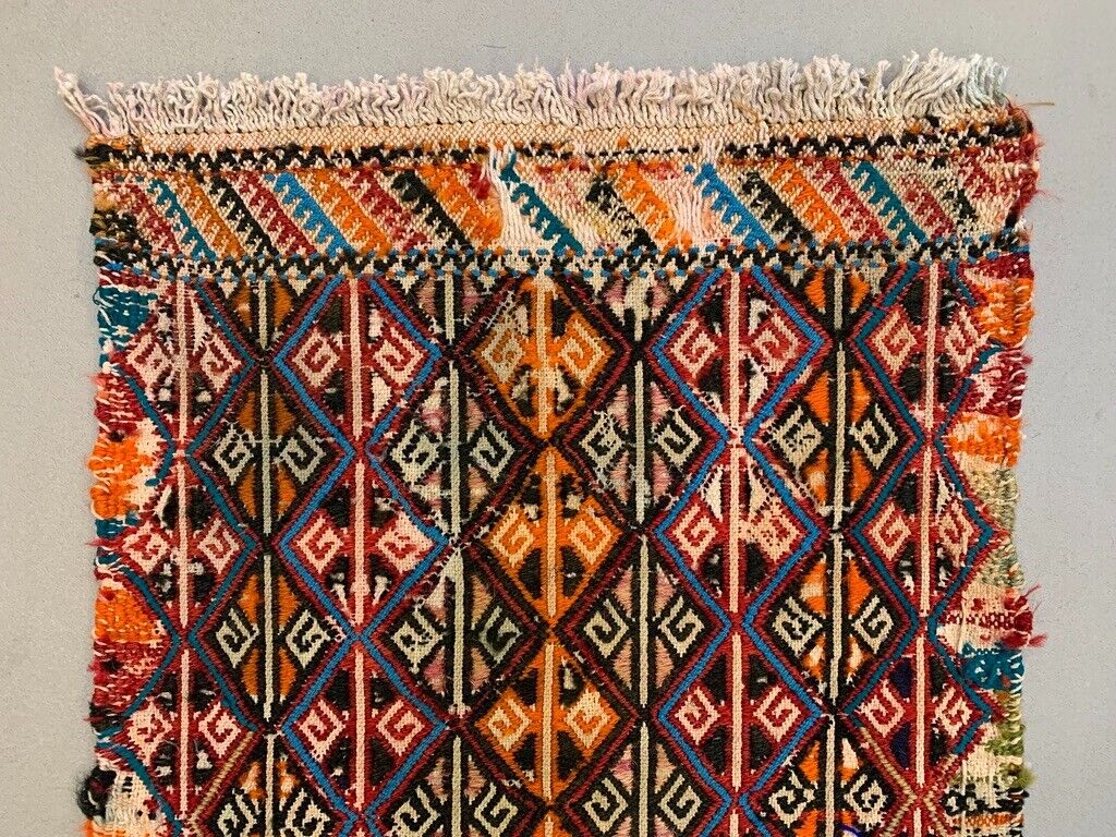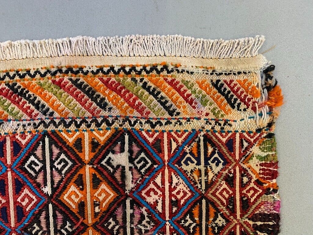 This is a lovely central Anatolian, Turkish kilim rug made around 1960s. Those little kilims are often made as as small sacks or sometimes as floor cushions.