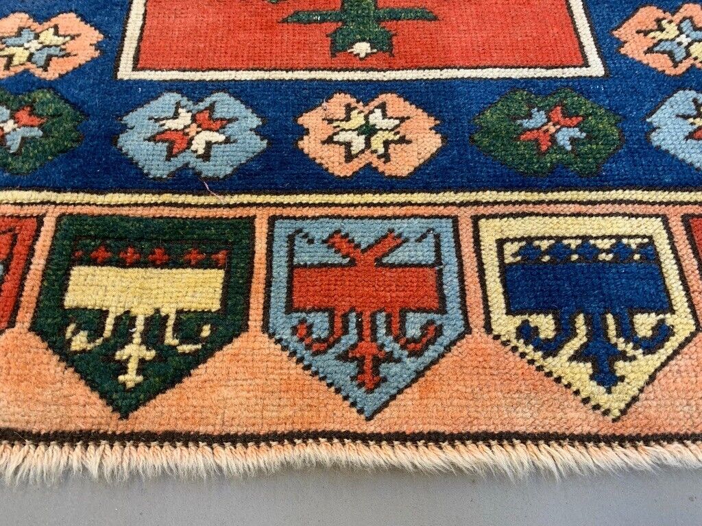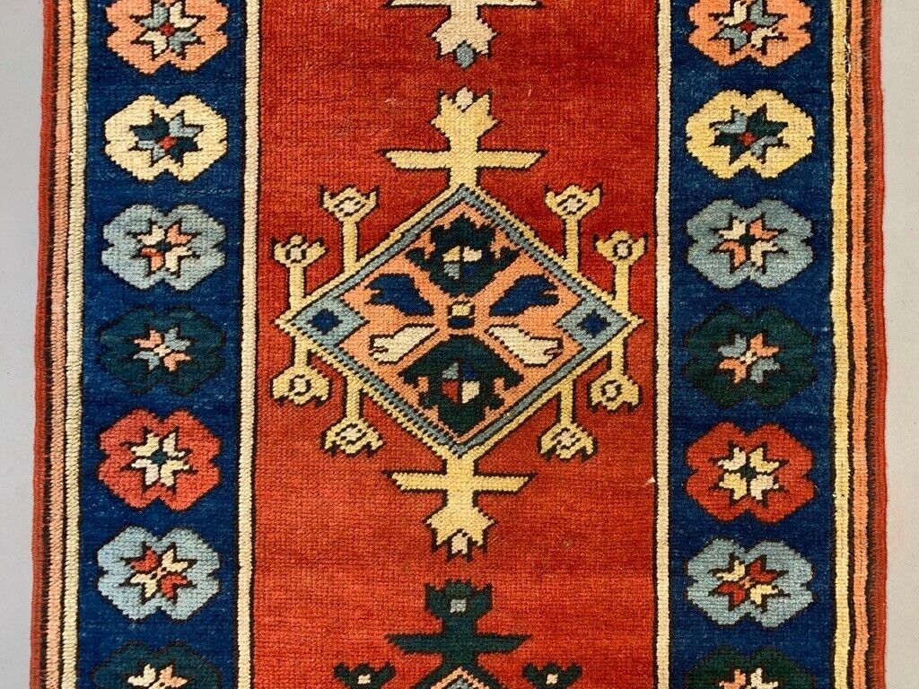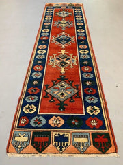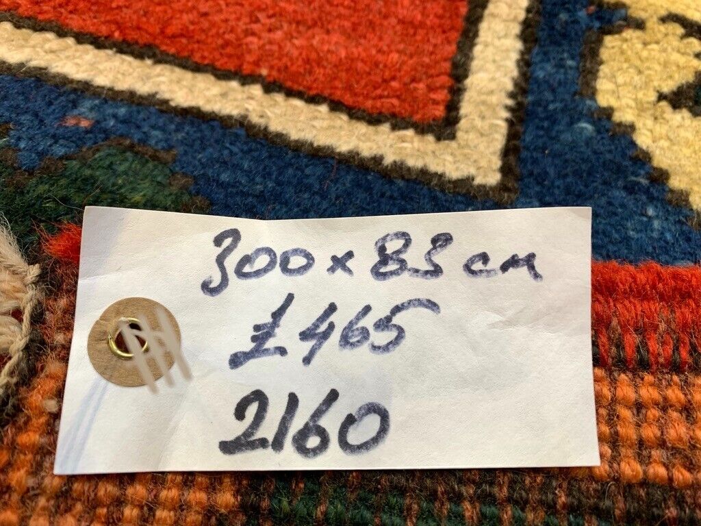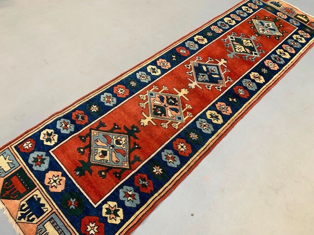 Vintage Turkish Runner 300x83 cm Kazak Rug, Terracotta Red, Green, Beige Blue